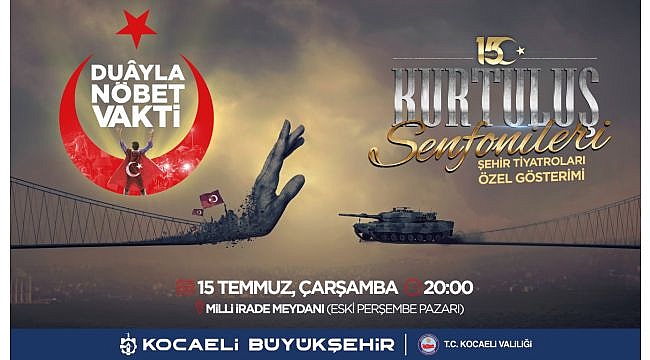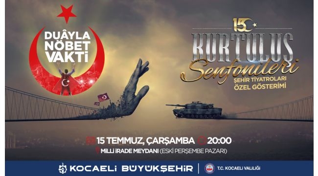 Kocaeli Büyükşehir Belediyesi Şehir Tiyatroları, bu yıl duayla nöbet vakti gecesinde ‘’Kurutuluş Senfonileri 15 Temmuz’’ özel gösterimini sahneleyecek. Türk milletinin 15 Temmuz 2016’da yazdığı destanla başlayan; Anadolu türküleri ve evrensel armonilerle harmanlanan Kurtuluş Senfonileri, 15 Temmuz’un 4. yılında Kocaeli halkıyla buluşacak. Milletimizin canıyla, kanıyla, ortak iradesiyle yazdığı mücadele ve kurtuluş destanı; 251 şehidimiz, binlerce gazimiz ve Ömer Halisdemir’in kimliğinde toplanan ölümsüz kahramanlarımız saygı ve minnetle anılacak.