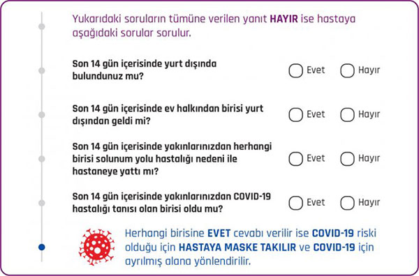 Sağlık Bakanlığı tarafından hazırlanan vaka kılavuzunda şu üç soru yer alıyor: Bakanlığın Kovid-19 sorgulama kılavuzuna göre, ateşi veya öksürük, sadece öksürük, nefes darlığı ve nefes almakta zorluk şikayetlerinden herhangi birisi varsa, hastaya maske takılacak ve Kovid-19 için ayrılmış alana yönlendirilecek.