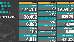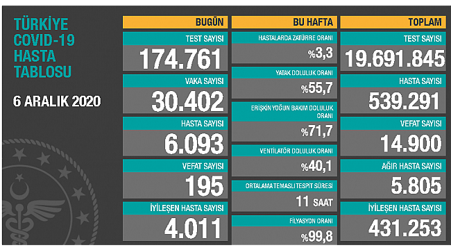 Günlük Koronavirüs Tablosu, "covid19.saglik.gov.tr" adresinden paylaşıldı. Güncel verilere göre, son 24 saatte 174 bin 761 Kovid-19 testi yapıldı, 6 bin 93 kişiye hastalık tanısı konuldu. Vaka sayısının ise 30 bin 402 olduğu açıklandı. Son 24 saatte 195 kişi Kovid-19 nedeniyle hayatını kaybetti, 4 bin 11 kişi iyileşti. Böylece Kovid-19 tedavisi tamamlananların sayısı 431 bin 253’e çıktı. Toplam test sayısı 19 milyon 691 bin 845’e ulaştı. Hasta sayısı 539 bin 291, vefat sayısı 14 bin 900, ağır hasta sayısı 5 bin 805 oldu. Haftalık verilere göre, bu hafta hastalarda zatürre oranı yüzde 3.3 yatak doluluk oranı yüzde 55.7, erişkin yoğun bakım doluluk oranı yüzde 71.7, ventilatör doluluk oranı yüzde 40.1, ortalama temaslı tespit süresi 11 saat, filyasyon oranı ise yüzde 99.8 olarak kayıtlara geçti. Sağlık Bakanı Fahrettin Koca, verilere ilişkin Twitter hesabından yaptığı paylaşımda, şu ifadeleri kullandı: “Bugün tespit edilen 6.093 yeni hastamız var. Ağır hasta sayısındaki artış hızı azalma eğiliminde. Tedbirler ve kısıtlamaların etkisini görmeyi ümit ediyoruz. Tedbirlere uymak hepimiz için insani bir gö-revdir. Kısıtlama olmadan da kalabalıklardan uzak durun”