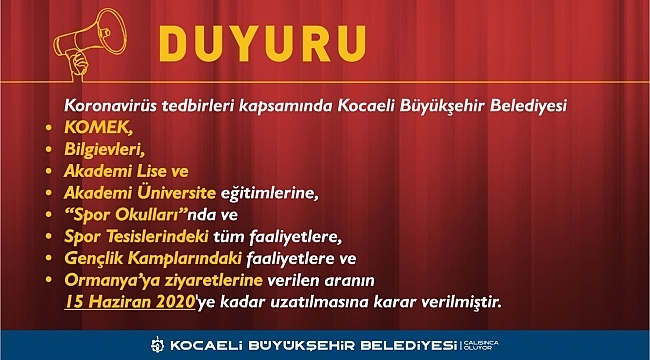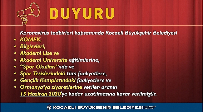 Kocaeli Büyükşehir Belediyesi, koronavirüs (Covid-19) ile ilgili yeni önlemler aldı. Bu kapsamda KO-MEK kursları, Bilgievleri, Akademi Lise ve Akademi Üniversite eğitimleri ve Spor Okulları’nda verdiği 3 haftalık arayı 15 Haziran 2020 tarihine kadar uzattı.