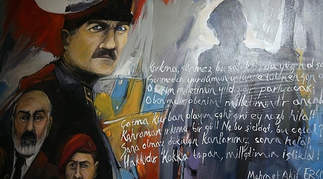 Eserlerinde, İstiklal Marşı'nın bazı bölümlerine de kabartma gibi farklı tekniklerle yer veren sanatçıların yaptığı 18 resim, Cumhuriyet'in 98. yılında vatandaşların beğenisine sunulacak.