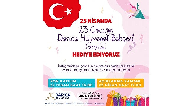Darıca Belediyesi, 23 Nisan Ulusal Egemenlik ve Çocuk Bayramı nedeniyle 23 çocuğa çekilişle Darıca Hayvanat Bahçesi gezisi hediye ediyor. Darıca Belediyesi’nin resmi instagram hesabından gelen yorumlar arasından canlı yayında gerçekleşecek çekilişle şanslı 23 çocuk ebeveyni ile birlikte 23 Nisan’da Hayvanat Bahçesi’ni ziyaret etme hakkı kazanacak. Çekilişe ilgi bir hayli yoğun olurken Darıca Belediye Başkanı Muzaffer Bıyık da yaptığı açıklamada “Bu yıl 23 Nisan’ı koronavirüs salgını ve sosyal mesafe kuralı nedeniyle buruk kutluyoruz. Çocuklarımız aileleriyle birlikte eğlenceli vakit geçirsinler diye çekilişle Hayvanat Bahçesi gezisi düzenledik. Çocukların en sevdiği alanlardan biri olan ve ilçemizin de simgelerinden olan Hayvanat Bahçemizde çocuklarımızı ebeveynleri ile ağırlayacağız” diye konuştu.