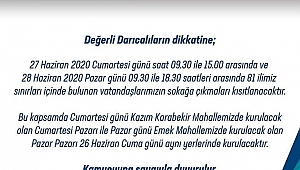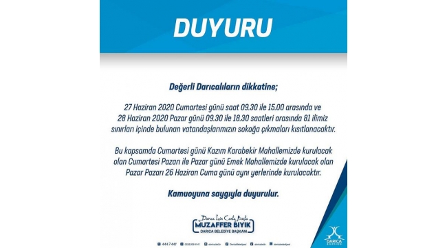 Darıca Belediyesi, koronavirüs tedbirleri kapsamında bu hafta sonu da sokağa çıkma yasağının uygulanacak olmasının ardından, pazarcı esnafı ve vatandaşın mağdur olmaması için ilçede hafta sonu kurulacak olan pazarların 26 Haziran Cuma günü kurulacağını açıkladı. Darıca Belediyesi tarafından yapılan duyuruda şu ifadelere yer verildi; “Covid-19 salgınıyla mücadele kapsamında, 27 Haziran Cumartesi günü saat 09.30 ile 15.00 arasında ve 28 Haziran Pazar günü 09.30 ile 18.30 saatleri arasında 81 ilimiz sınırları içinde bulunan vatandaşlarımızın sokağa çıkmaları kısıtlanacaktır. Cumartesi günü Kazım Karabekir Mahallemizde kurulacak olan Cumartesi Pazarı ile Pazar günü Emek Mahallemizde kurulacak olan Pazar Pazarı 26 Haziran Cuma günü aynı yerlerinde kurulacaktır.”