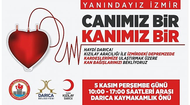 İzmir’de yaşanan deprem felaketinin ardından, kan bağışının önemi bir kez daha ortaya çıkarken; Darıca Kaymakamlığı, Darıca Belediyesi ve Türk Kızılayı Darıca Şubesi, ortaklaşa kan bağışı kampanyası başlattı. “Canımız Bir Kanımız Bir” sloganıyla düzenlenen kan bağışı kampanyası, 5 Kasım Perşembe günü 10.00-17.00 saatleri arasında Darıca Kaymakamlığı önünde gerçekleşecek.