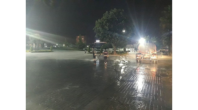 Gebze Belediye Başkanı Zinnur Büyükgöz'ün talimatları doğrultusunda İlçede koronavirüs tedbileri kapsmaındaki çalışmalar sürüyor.Bugün gece saatlerinde Kent Meydanı baştan aşağıya dezenfekteli su ile yıkandı.