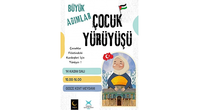 YediHilal Gebze temsilciliği ve TÜGVA Gebze temsilciliği tarafından yapılacak olan yürüyüşte 3-13 yaş arasındaki çocuklar, Filistinli kardeşlerine dayanışma mesajı ile bir araya gelecekler. Yürüyüş 14 Kasım Salı günü (yarın) saat 14.00’da Gebze Eskiçarşı (Hükümet konağı tarafı) girişinden başlayacak. Gebze Kent Meydanı’na kadar yapılacak yürüyüşün ardından çocuklar tarafından şiir okuyacak ve konuşma yapacaklar. Gerçekleştirilecek olan yürüyüşle ilgili olarak yapılan açıklamada, “Bizler bu yürüyüşle, İşgalci İsrail’in Filistin’e karşı yürüttüğü zulmü protesto etmek ve dünya kamuoyunun dikkatini bu konuya çekmeyi amaçlıyoruz. Çocuklarımıza Kudüs bilincini aşılamak ve çocuklarımızın bu yürüyüşle Gazze’deki kardeşlerimize umut olmasını arzuluyoruz. Programımıza tüm annelerimiz çocuklarıyla birlikte davetlidir” denildi.