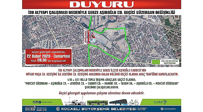 Kocaeli Büyükşehir Belediyesi, İSU altyapı çalışması nedeniyle Gebze İlçesi Aşıroğlu Caddesi’nde geçici güzergâh uygulaması yapılacak. Uygulama, 22 Şubat Cumartesi günü 09.30 itibariyle başlayacak.