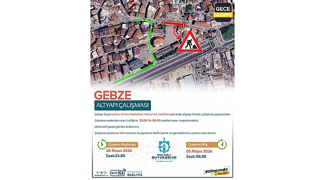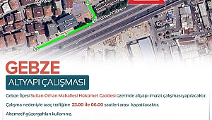 Yapılan açıklamaya göre, Gebze Sultan Orhan Mahallesi Hükümet Caddesi üzerinde altyapı imalat çalışması yapılacak. Çalışma kapsamında cadde, 23.00 ile 06.00 saatleri arasında araç trafiğine kapatılacak.