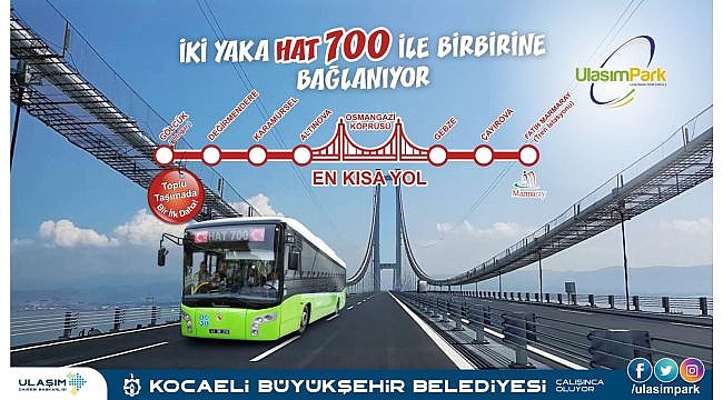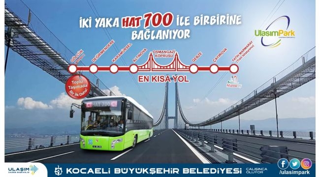 Ulaşım Park AŞ’nin hizmetinde olan Hat 700, ilk seferine 1 Temmuz Çarşamba günü başlıyor. Hat 700 Gölcük ilçesinden kalkış yapacak. Sefer sırasında Karamürsel Dereköy durağına kadar hat 700 yolcu alabilecek. Osmangazi Köprüsü’nü kullanacak olan Hat 700’ün seferi Gebze ilçesi Kent önünde son bulacak. Gebze ilçesi Kent önünden kalkacak hat 700 Osmangazi Köprüsü’ne kadar her duraktan yolcu alabilecek.