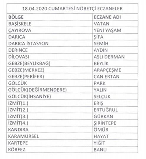 Kocaeli Eczacılar Odası haftasonu uygulanacak olan sokağa çıkma yasağında açık olacak eczanelerin listesini paylaştı. Yapılan açıklamada: "18 Nisan 2020 Cumartesi günü il genelinde sadece 24 saat nöbetçi eczaneler açık olacaktır. Diğer tüm eczaneler kapalı olacaktır. (Gündüz nöbet uygulaması olanlarda dahil)" ifadelerine yer verildi.