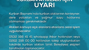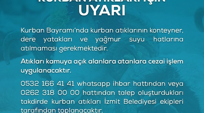İzmit Belediyesi ekipleri, Kurban Bayramı’nda kurban atıklarının konteyner, dere yatakları ve yağmur suyu hatlarına atılmaması konusunda vatandaşları uyardı. Atıkları kamuya açık alanlara atanlara cezai işlem uygulanacağını belirten yetkililer, 0532 166 41 41 whatsapp ihbar hattından veya 0262 318 00 00 hattından talep oluşturdukları takdirde kurban atıklarının alınacağını belirtti.