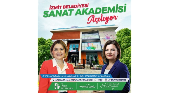 İzmit Belediyesi, kente değer katacak olan İzmit Sanat Akademi’ni hizmete açıyor. Bir gün ertelenen program 21 Ekim Perşembe günü saat 17.30’da CHP Genel Sekreteri Selin Sayek Böke’nin katılımıyla gerçekleşecek. Daha önce 20 Ekim’de gerçekleşeceği açıklanan program Böke’nin Genel Merkez’de ani gelişen programı nedeniyle bir gün ertelendi.