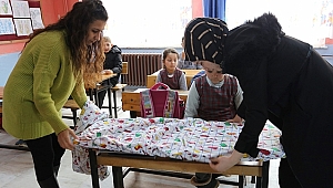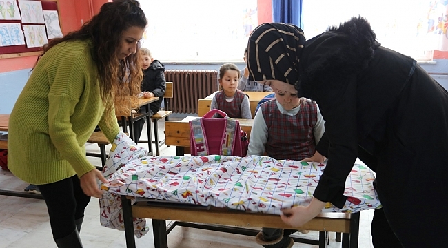 Kursiyerlerin sınıfa ellerinde örtülerle girmesi ise çocukları çok sevindirdi. Sıralarına dikilen örtüleri inceleyen ve çok beğenen öğrenciler, bu güzel karne hediyesi için KO-MEK’e teşekkür etti.