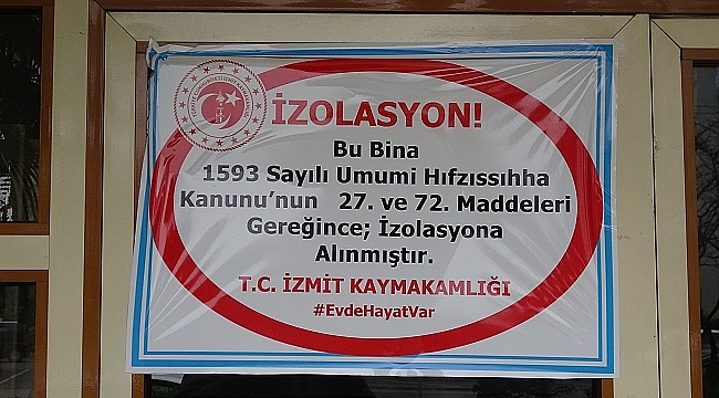İzmit'e bağlı Yahyakaptan Mahallesi Necip Fazıl Caddesi'ndeki 8 katlı apartmanda oturan kişinin koronavirüs testi pozitif çıktı. Bunun üzerine İlçe Umumi Hıfzıssıhha Kurulu, hastanın evinin bulunduğu 8 katlı apartmanın karantinaya alınmasına karar verdi. Binanın giriş kapısına, İzmit Kaymakamlığı'nca, "Bu bina 1593 sayılı Umumi Hıfzısıhha Kanunu’nun 27. ve 72. maddeleri gereğince izolasyona alınmıştır" yazısı asıldı.