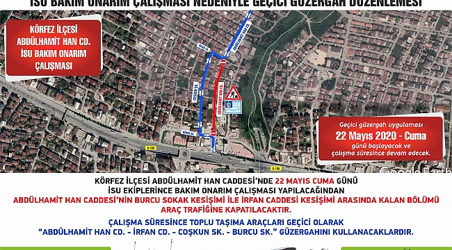 İSU bakım onarım çalışması nedeniyle Körfez ilçesi Abdülhamit Han Caddesi’nin Burcu sokak kesişimi ile İrfan Caddesi kesişimi arasındaki kalan bölümü geçici olarak araç trafiğine kapatılacak. Sivil araçlar, kapatılacak bölüm haricindeki diğer yolları kullanabilecek. Bölgede hizmet veren toplu taşıma araçları için Ulaşım Dairesi Başkanlığı’nca geçici güzergah oluşturuldu.