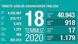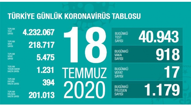 Bakanlığın internet sitesinde yer alan ve Sağlık Bakanı Fahrettin Koca'nın da Twitter'dan paylaştığı "Türkiye Günlük Koronavirüs Tablosu"nun güncel verilerine göre, bugün 40 bin 943 test yapıldı ve 918 kişiye Kovid-19 tanısı konuldu. Son 24 saatte 17 hasta vefat etti, 1179 hasta iyileşti. Toplam test sayısı 4 milyon 232 bin 67, vaka sayısı 218 bin 717, vefat sayısı 5 bin 475 olarak kayıtlara geçti. Toplam yoğun bakımdaki hasta sayısı 1231, solunum cihazına bağlı hasta sayısı 394, iyileşen hasta sayısı 201 bin 12 oldu. Sağlık Bakanı Fahrettin Koca, Twitter hesabından son verilere ilişkin, şu değerlendirmede bulundu: “1.000’in üstünde gerçekleştiği en son güne kıyasla, yeni vaka sayımız, bugün 90 azaldı. SON 3 GÜNDE en çok vaka görülen beş ilimiz: İstanbul, Ankara, Gaziantep, Konya, Diyarbakır. En az vaka görülen beş ilimiz: Artvin, Tunceli, Bayburt, Kırklareli, Bartın.”