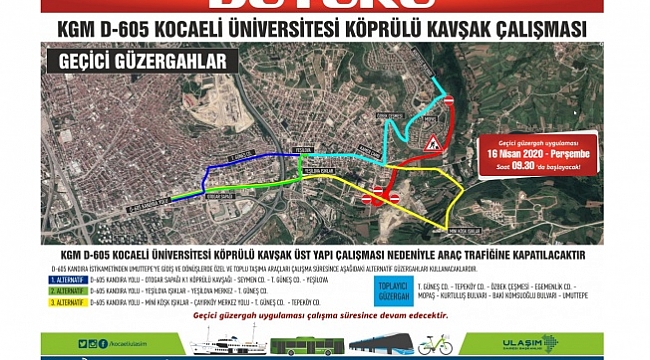 Karayolları Genel Müdürlüğü’nün D-605 karayolu, Kocaeli Üniversitesi köprülü kavşak üst yapı çalışması nedeniyle araç trafiğine kapatılacaKarayolları Genel Müdürlüğü’nün D-605 karayolu, Kocaeli Üniversitesi köprülü kavşak üst yapı çalışması nedeniyle araç trafiğine kapatacak. Kocaeli Büyükşehir Belediyesi bölgeyi kullanan toplu taşıma araçları ve özel araçlar için geçici güzergah oluşturdu.