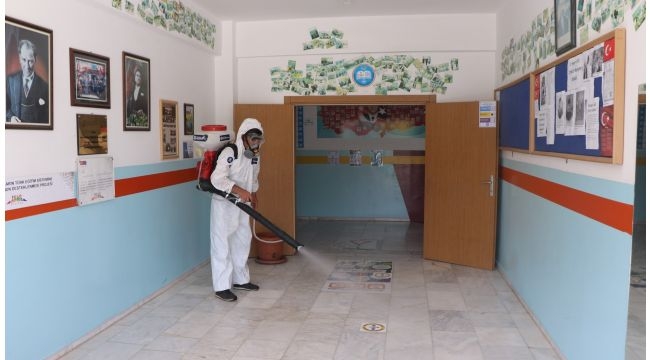 Büyükşehir Belediyesi ekiplerince okulların giriş kapısı, çocukların elleriyle dokunabilecekleri kapı kolları ve çerçeveleri, merdivenler, korkuluklar, sınav olacakları sınıflar, oturacakları sıralar, öğretmen masaları, pencere kolları ve lavabolar dezenfekte edildi.