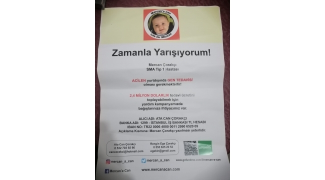 Mercan Çorakçı, tip 1 SM hastası. Tedavisi için ise yurt dışına giderek gen tedavisi olması gerekiyor. Bu nedenle Çorakçı ailesi, çaresiz bir şekilde yardım çağrısında bulundu. Hastalığının tedavisi için 2.4 Milyon Dolar gereken Mercan bebek için hayırseverlerin duyarlılığı bekleniyor. Baba Ata Can çorakçı başta ilimiz olmak üzere ülkemizde yaşayan hayırseverlere çağrıda bulunarak biricik evladı için destek arayışında. Acil tedavi için bağışta bulunacak kişilerin 0532 703 92 96 numaralı telefondan irtibata geçmeleri gerekiyor.