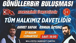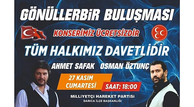 MHP Darıca İlçe Teşkilatı "Gönüller Bir" gecesinde ücretsiz konser düzenleyecek.Sevilen sanatçılar Ahmet Şafak ve Osman Öztunç'un sahne alacağı konser 27 Kasım Cumartesi günü Darıca'da gerçekleşecek.Konser için hazırlıklarının devam ettiğin belirleten MHP Darıca İlçe Başkanı Yücel Bektaş herkesi 27 Kasım akşamı konsere beklediklerini söyledi.
