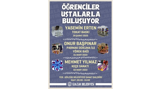 Gölcük Belediyesi, düzenlediği etkinliklerle; unutulmaya yüz tutmuş, kültürel mirasımız olan sanatları genç kuşaklara aktarmaya devam ediyor. Bu kapsamda; Gölcük Belediyesi ve İlçe Milli Eğitim Müdürlüğü ile iş birliğinde, Gölcük Belediyesi Sanat Galerisi’nde “Öğrenciler Ustalarla Buluşuyor” etkinlikleri düzenlenecek. 28 Şubat-1-2 Mart tarihlerinde 09.00-15.00 saatleri arasında gerçekleşecek etkinliklerde Kültür ve Turizm Bakanlığı Somut Olmayan Kültürel Miras Taşıyıcısı unvanı bulunan sanatçılar, Gölcüklü öğrencilere; Tokat baskı, parmak dokuma ile yörek bağı ve keçe sanatı eğitimleri verecek.